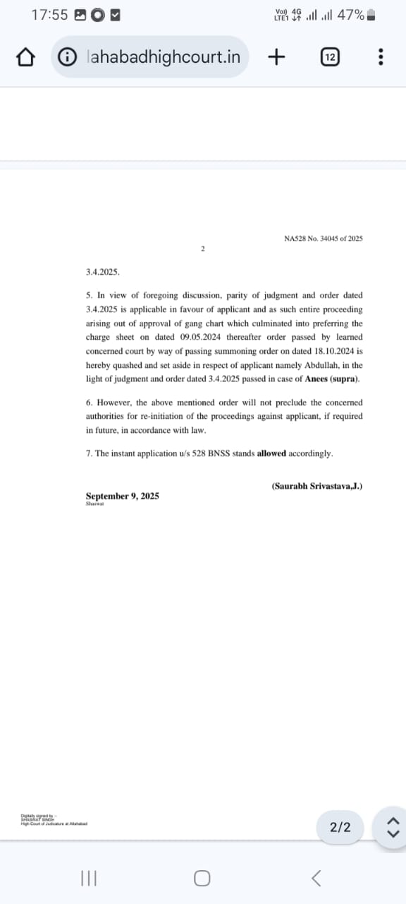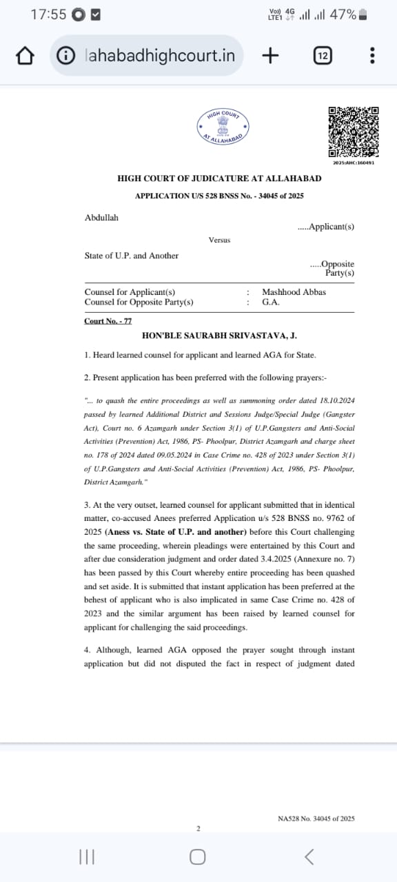 माननीय उच्च न्यायालय इलाहाबाद ने अंबारी ग्राम निवासी अब्दुल्ला पुत्र अनीश पर थाना फूलपुर पुलिस द्वारा नियम विरुद्ध तरीके से लगाए गए गैंगस्टर एक्ट की कार्रवाई को अभियुक्त अब्दुल्ला की तरफ से उपस्थित अधिवक्ता सैयद मशहूदअब्बास के तर्कों को सुनकर माननीय उच्च न्यायालय इलाहाबाद द्वारा संपूर्ण गैंगस्टर मुकदमा अपराध संख्या 428 सन 2024 थाना फूलपुर अंतर्गत धारा 3 (1) गैंगस्टर एक्ट 1986की कार्रवाई को विधि विरुद्ध पाते हुए निरस्त कर दिया है माननीय उच्च न्यायालय इलाहाबाद द्वारा अपने पारित आदेश दिनांक 09/09/2025 से अभियुक्त अब्दुल्ला पुत्र अनीश निवासी अंबारी थाना फूलपुर आजमगढ़ को को बड़ी राहत प्रदान की है, अभियुक्त के विरुद्ध आदेश दिनांक 5 जून 2025 से गैर जमानती वारंट चल रहा था माननीय उच्च न्यायालय के अभियुक्त तथा अभियुक्त के परिवार ने राहत की सांस ली है।