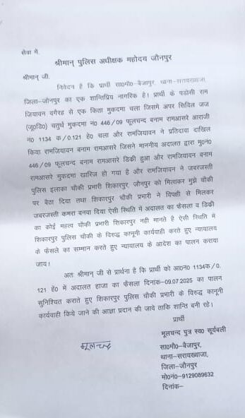 जौनपुर। न्यायालय के आदेश को ताक पर रखने का मामला सरायख्वाजा थाना क्षेत्र से सामने आया है। वैजापुर गांव निवासी मूलचन्द पुत्र स्व. सूर्यबली ने पुलिस अधीक्षक को भेजे प्रार्थना पत्र में शिकारपुर चौकी प्रभारी पर गंभीर आरोप लगाए हैं।