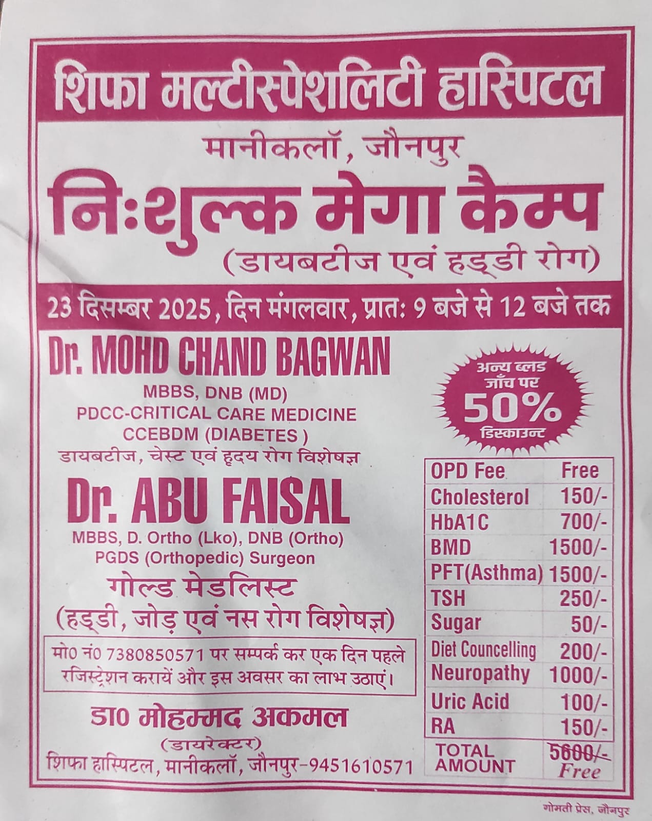 पता: शिफा मल्टीस्पेशलिटी हॉस्पिटल, मानीकलां, जौनपुर
