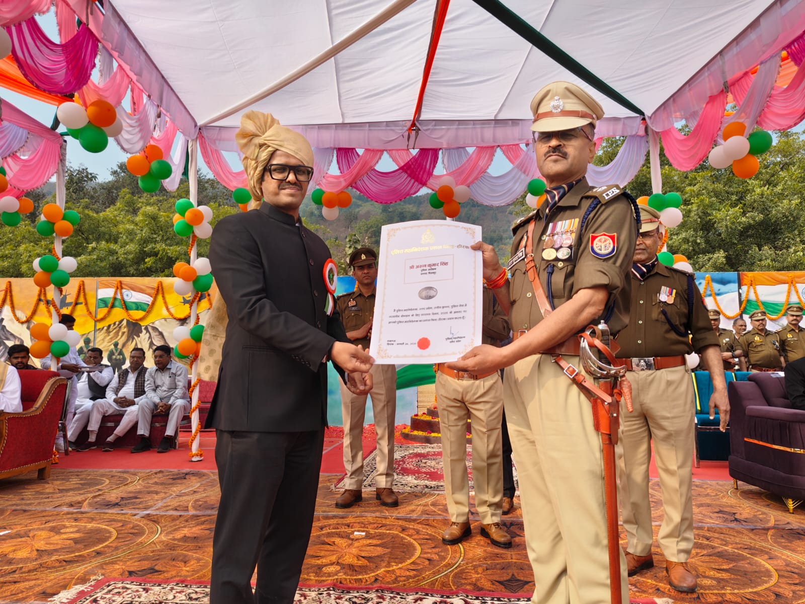 तत्पश्चात मुख्य अतिथि महोदय ने परेड के सभी कमाण्डरों का परिचय लिया एवं बेहतरीन परेड के लिये सभी की भूरी-भूरी सराहना की तथा मुख्य अतिथि महोदय द्वारा *पुलिस महानिदेशक उ0प्र0 महोदय के द्वारा उत्तर प्रदेश पुलिस सेवा में सराहनीय योगदान के लिए सम्मानित श्री अरुण कुमार सिंह पुलिस अधीक्षक चित्रकूट को पुलिस सेवा में सराहनीय योगदान के लिए प्रशंसा चिन्ह(हीरक),महामहीम राष्ट्रपति द्वारा श्री सत्यपाल सिंह अपर पुलिस अधीक्षक चित्रकूट को विशिष्ट सेवा पदक प्रदान किया गया* एवं गृह मंत्रालय से सम्मानित निरीक्षक श्री शम्भू दयाल डायल 112,निरीक्षक श्रीमती रीता सिंह प्रभारी साइबर थाना,उ0नि0 श्री राम सिंह थानाध्यक्ष सरधुवा को उत्कृष्ट सेवा पदक,श्री कुन्ज बिहारी मुख्य आरक्षी चालक,श्री वहीद खान मुख्य आरक्षी चालक को सराहनीय सेवा सम्मान चिन्ह एवं पुलिस मुख्यालय लखनऊ से सम्मानित श्री अरविन्द वर्मा पुलिस उपाधीक्षक,श्री फहद अली पुलिस उपाधीक्षक,उ0नि0 सत्येन्द्र नाथ तिवारी,उ0नि0 मो0 इकराम खां,उ0नि0 चन्द्रकान्त शुक्ला,रेडियों उ0नि0 श्री पवन कुमार,मुख्य आरक्षी रमाकान्त द्विवेदी,मुख्य आरक्षी वहीद अहमद,मुख्य आरक्षी राकेश कुमार,मुख्य आरक्षी अतुल यादव,म0मुख्य आरक्षी याशमीन बानों,मु0आ0स0पु0 विरेन्द्र कुमार,मु0आ0 पारसनाथ पाण्डेय,मु0आ0 चालक बृजेश सिंह,मु0आ0 चालक मो0 बसार,मु0आ0 चालक वहीद खां,आ0 केवल चौधरी,आ0 रामकिशोर,आ0 दिलीप कुमार,फायरमैन मनोज कुमार,फायरमैन शिवम तिवारी,ब्लॉक आर्गनाइजर संतोष कुमार सिंह एवं विजय यादव को महाकुंभ 2025 में उत्कृष्ट कार्य करते हुए सुरक्षा क्षेत्र में विशिष्ट योगदान के लिए महाकुंभ सेवा मेडल एवं प्रशस्ति पत्र से सम्मानित किया गया। यूपी 112 मुख्यालय से प्राप्त प्रशस्ति पत्र-कमाण्डर आ0अभिषेक सिंह बरगढ़, कमाण्डर आ0 सुब्बा लाल बरगढ़, कमाण्डर आ0 मनीष यादव राजापुर, कमाण्डर आ0 अंकित शुक्ला राजापुर, कमाण्डर आ0 शिवम मिश्रा राजापुर, कमाण्डर आ0 शिवा सिंह आरोआपी कार्यालय, हो0गा0 चालक फूल चन्द्र बरगढ़, हो0गा0 चालक रामबाबू राजापुर, हो0गा0 चालक अनमोल राजापुर,वर्ष 2025 में सराहनीय कार्य करने वाले अधिकारी/कर्मचारीगण प्रतिसार निरीक्षक श्री राम शीष यादव,निरीक्षक श्री एमपी त्रिपाठी प्रभारी स्वाट टीम,निरीक्षक श्री अशोक कुमार यादव प्रभारी आईजीआरएस,निरीक्षक श्री शिवमूरत यादव प्रभारी आर0टी0सी0,निरीक्षक श्री अजीत कुमार पाण्डेय अपराध शाखा,उ0नि0 श्री बृजबिहारी थाना राजापुर,उ0नि0स0पु0 राकेश कुमार समाधिया पुलिस लाइन,म0मु0आ0 रचना यादव,म0मु0आ0 हर्षिता दीक्षित स्थानीय अभिसूचना इकाई,आ0 ललित सोनी थाना मानिकपुर,आ0 अमित द्विवेदी थाना राजापुर,आ0 भाष्कर शुक्ला जीआरपी,आ0 मानवेन्द्र सिंह शाखा आई0जी0आर0एस0,आ0 विजय वर्मा शिकायत 